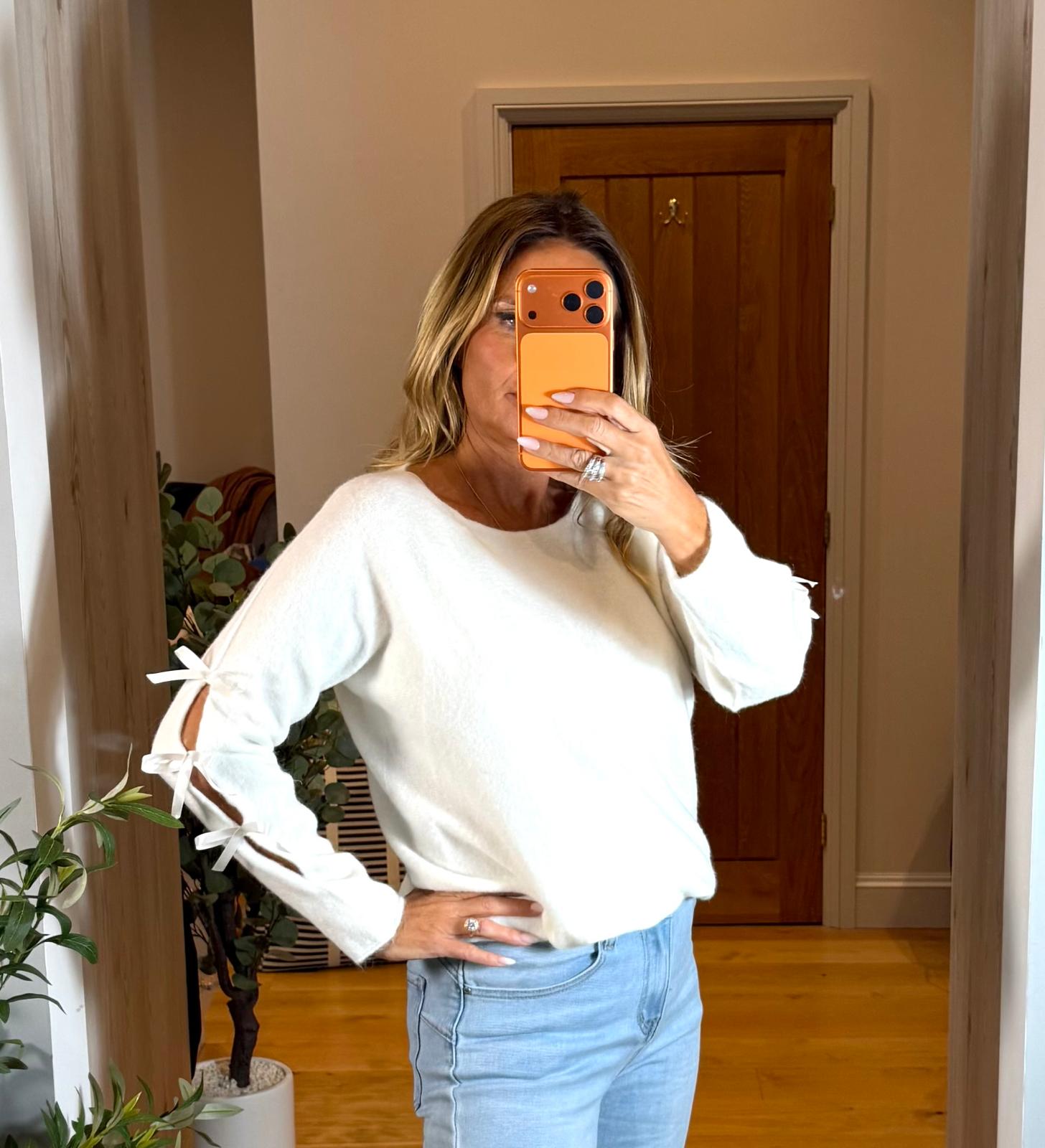Amelia Slash Neck Jumper with Satin Bows on Sleeves