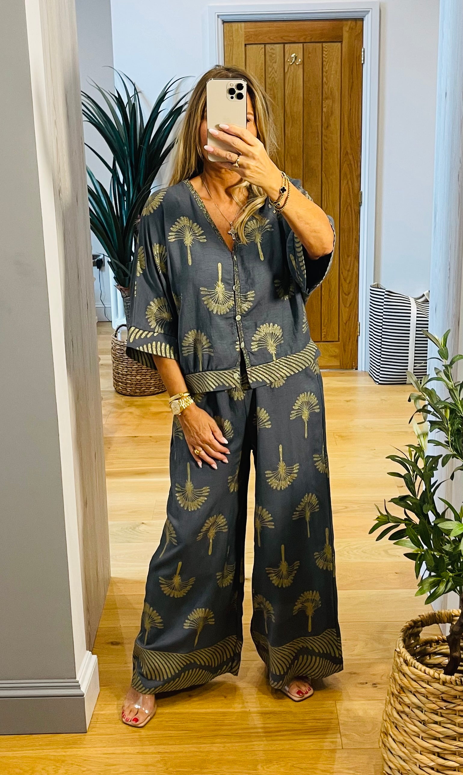 - Stunning & unusual top & trouser co-ord with beautiful gold palm detail fabric