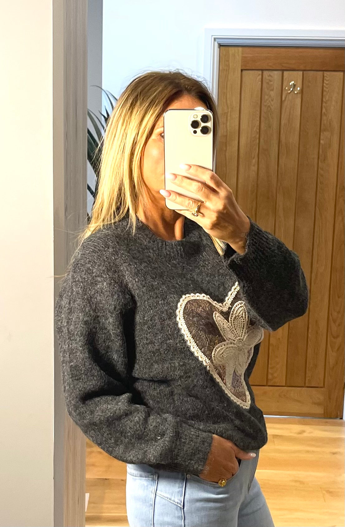 Valerie Charcoal Black Jumper with Heart and Flower Sequin Motif